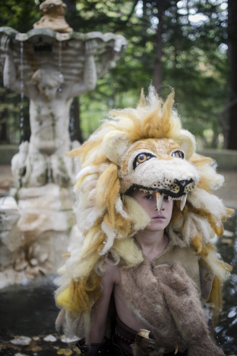 Can I use this old baseball hat? See we'll cover it with foam, then cover the foam with strips of wool fabric. Now's the fun part: we'll sculpt the lion's head with bags and bags of wool stabbed a million times to form the shapes we want. How does the story go again?